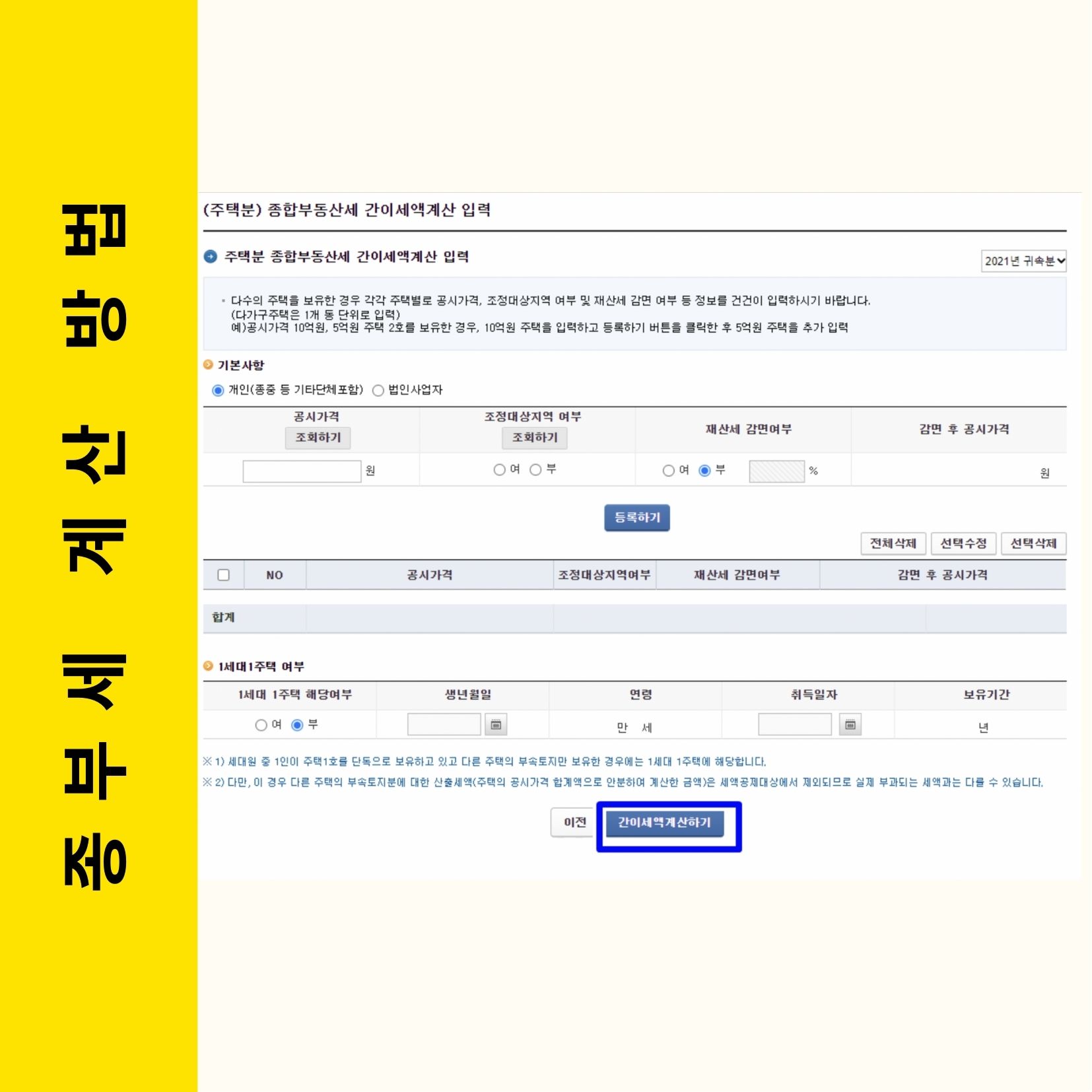 주택과 종합합산 토지, 별도합산 토지 중 선택을 클릭하고, 정보를 입력한 후 간이세액 계산하기를 클릭하면 됩니다.