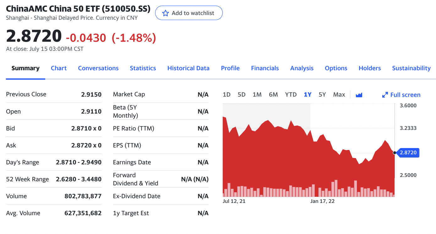 총자산 513억위안. 상하이50(SSE50) 지수를 추종하는 중국 대표 ETF